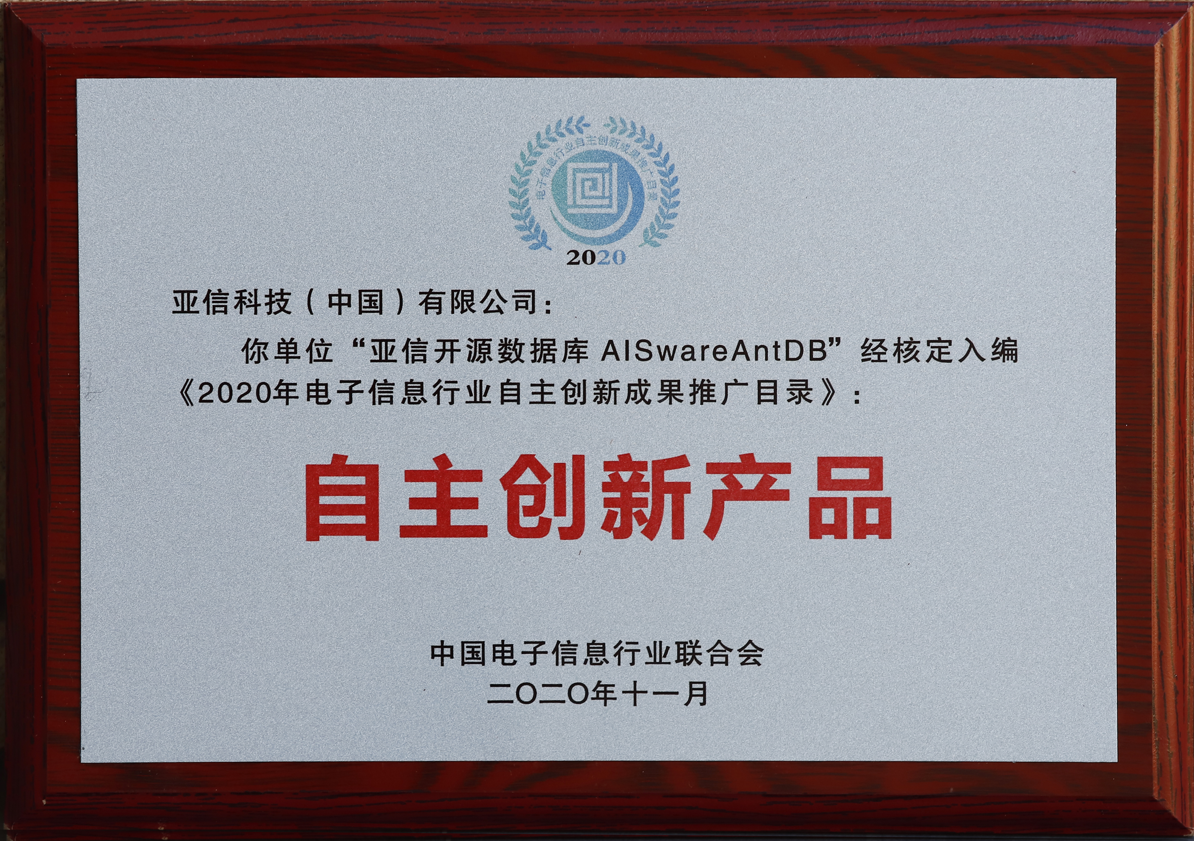 2020年11月 亚信开源数据库AISWare AntDB荣获“自主创新产品”