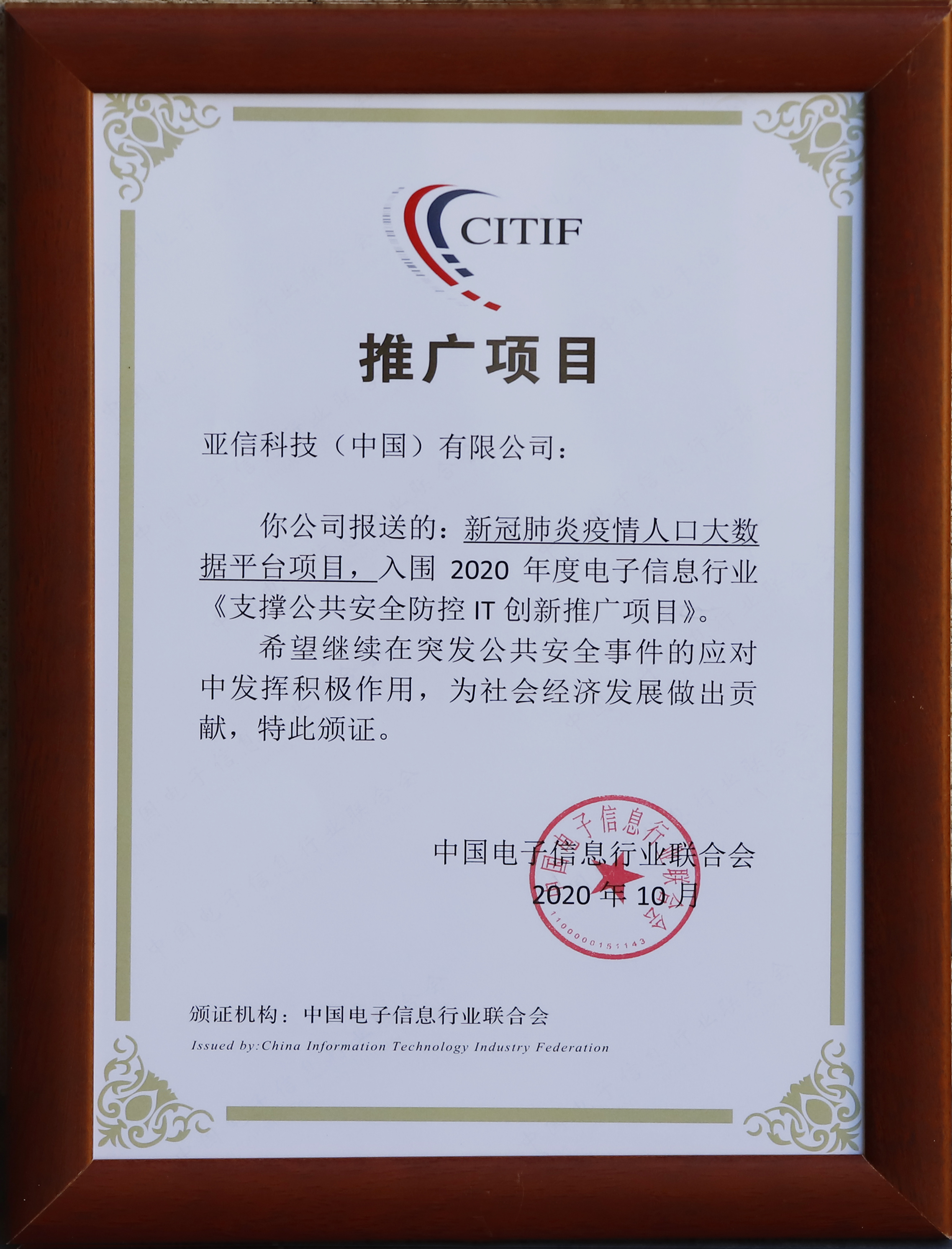 2020年10月 304am永利集团新冠肺炎疫情人口大数据平台项目入围“2020年度电子信息行业《支撑公共安全防控IT创新推广项目》”