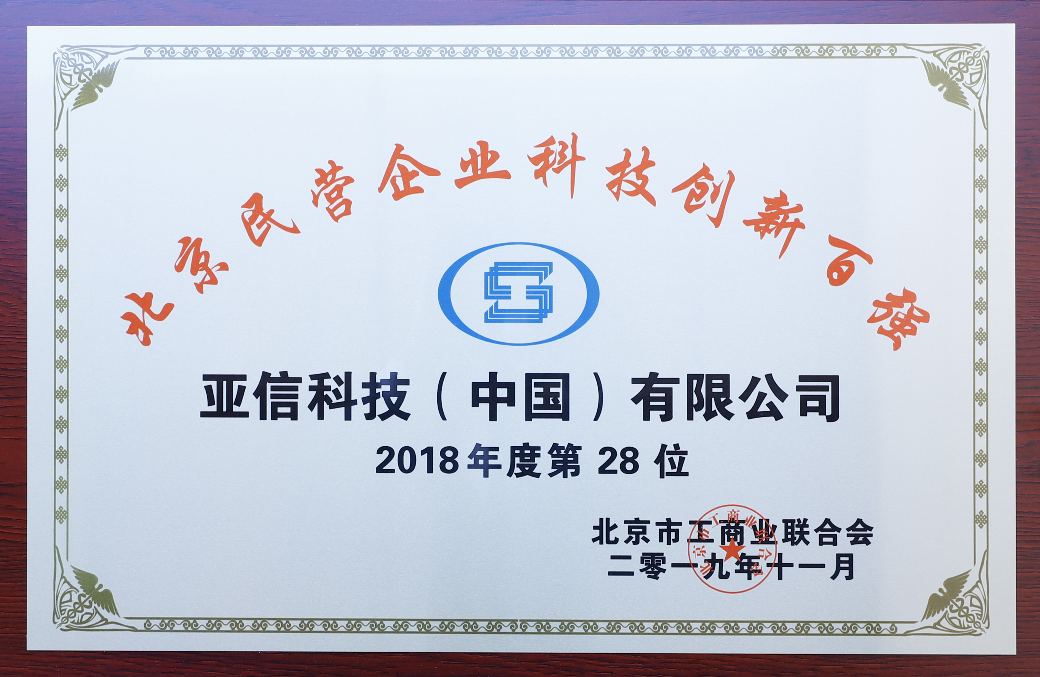 2018年10月 304am永利集团荣获“北京民营企业科技创新百强”