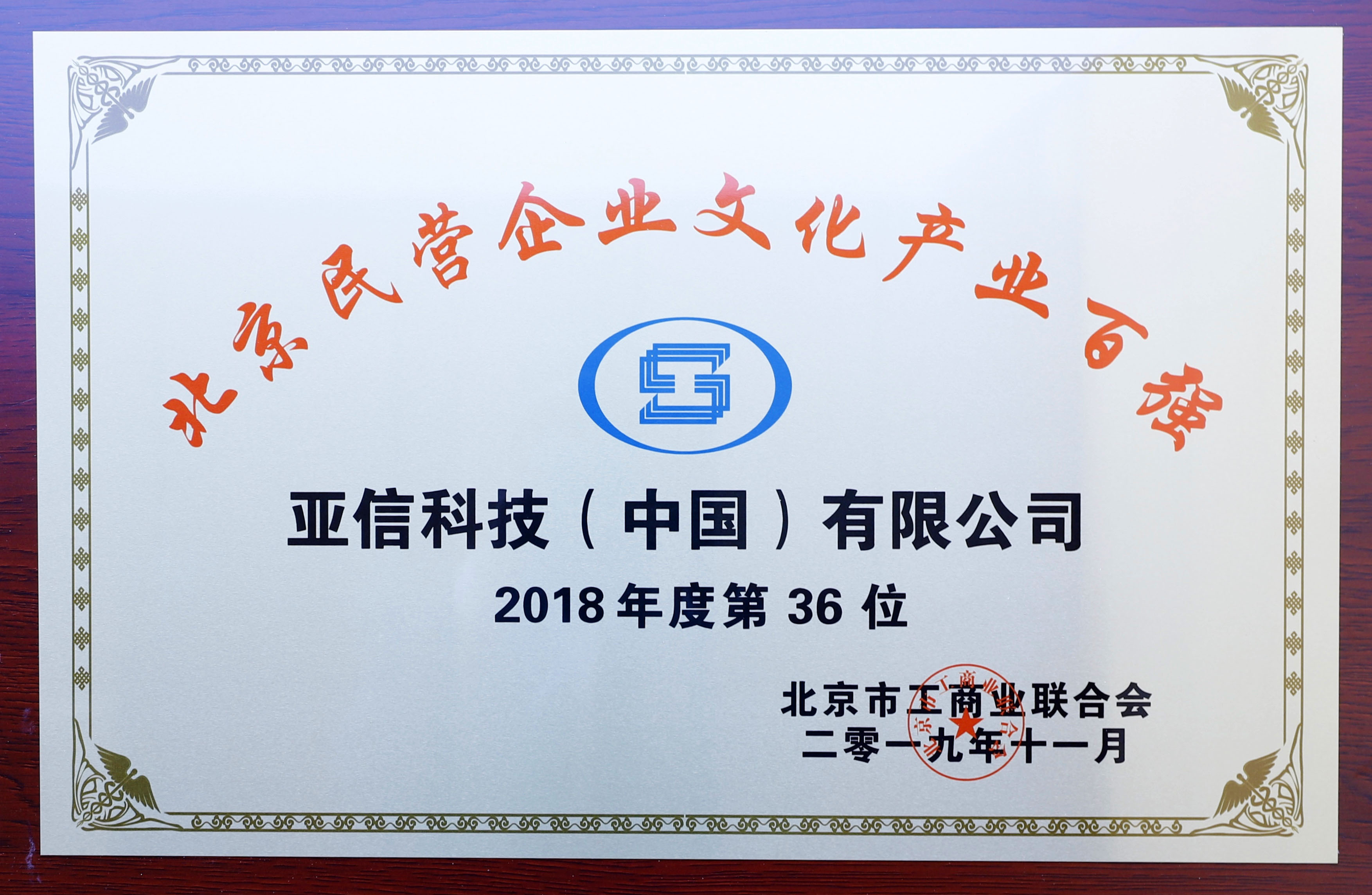 2019年11月 304am永利集团荣获“北京民营企业文化产业百强”