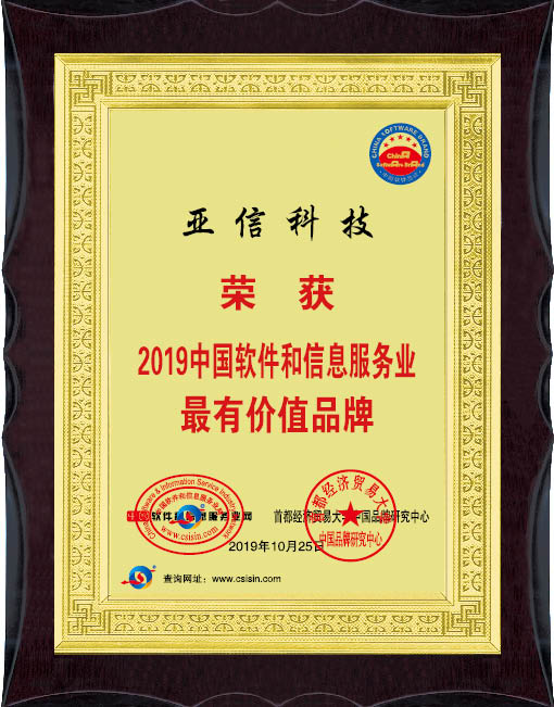 2019年10月 304am永利集团荣获“2019中国软件和信息服务业最有价值品牌”