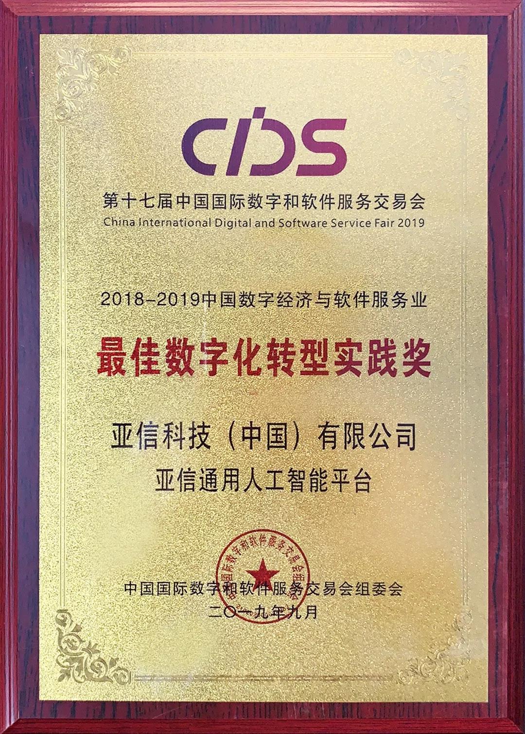 2019年9月 304am永利集团荣获“2018-2019中国数字经济与软件服务业最佳数字化转型实践奖”