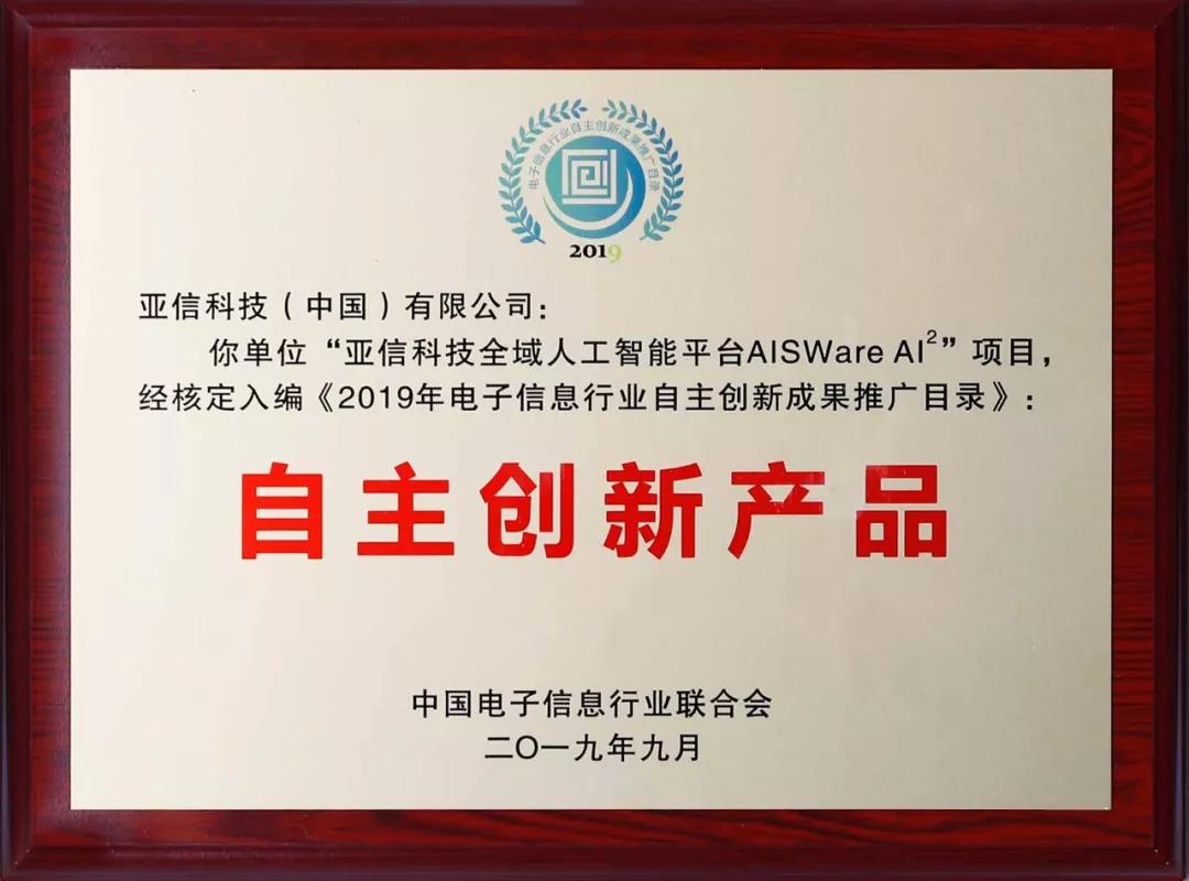 2019年9月 304am永利集团全域人工智能平台AISWare AI²荣获“自主创新产品”