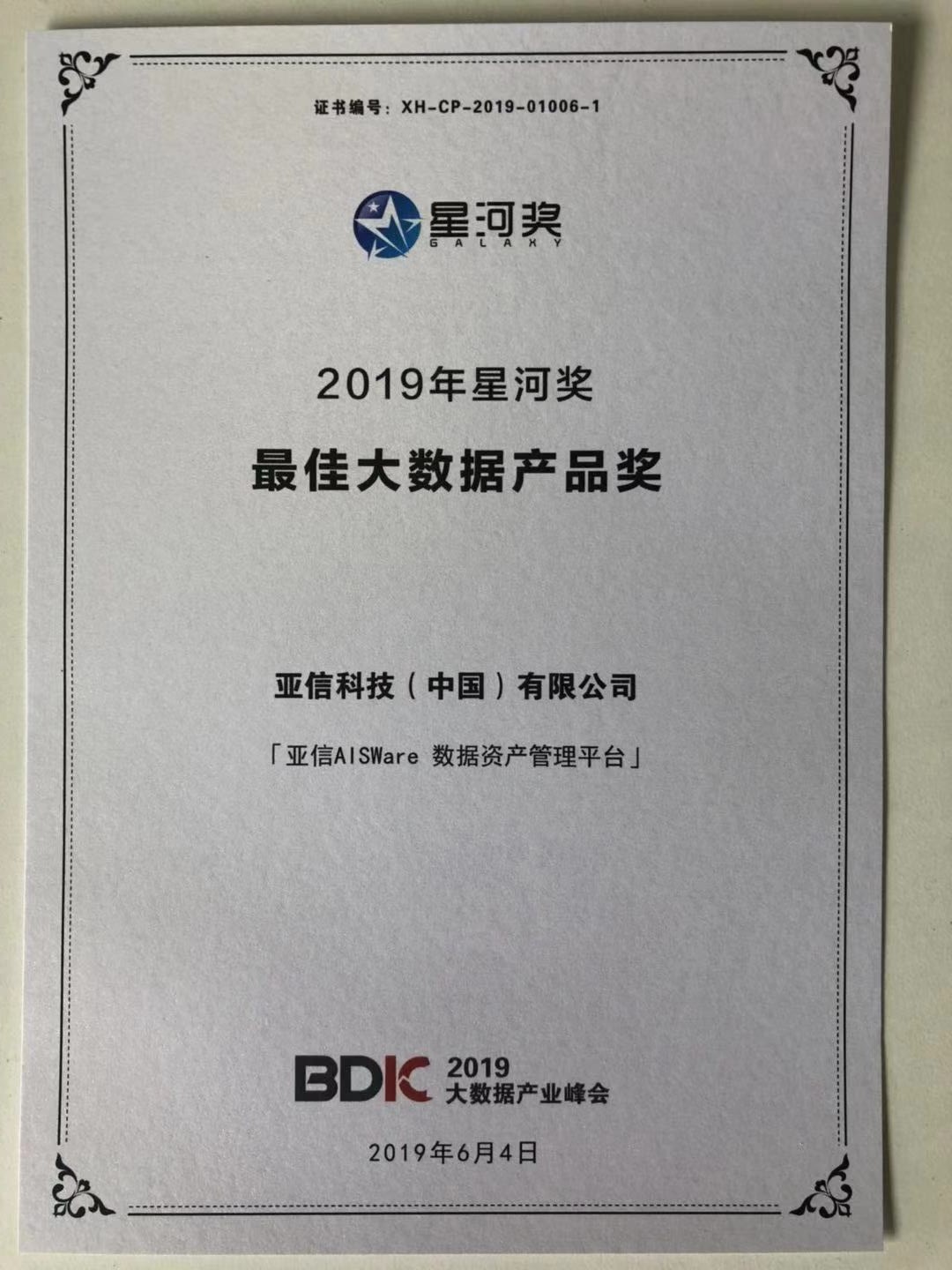 2019年6月 304am永利集团AISWare数据资产管理平台荣获“大数据星河奖TOP10最佳优秀产品奖”