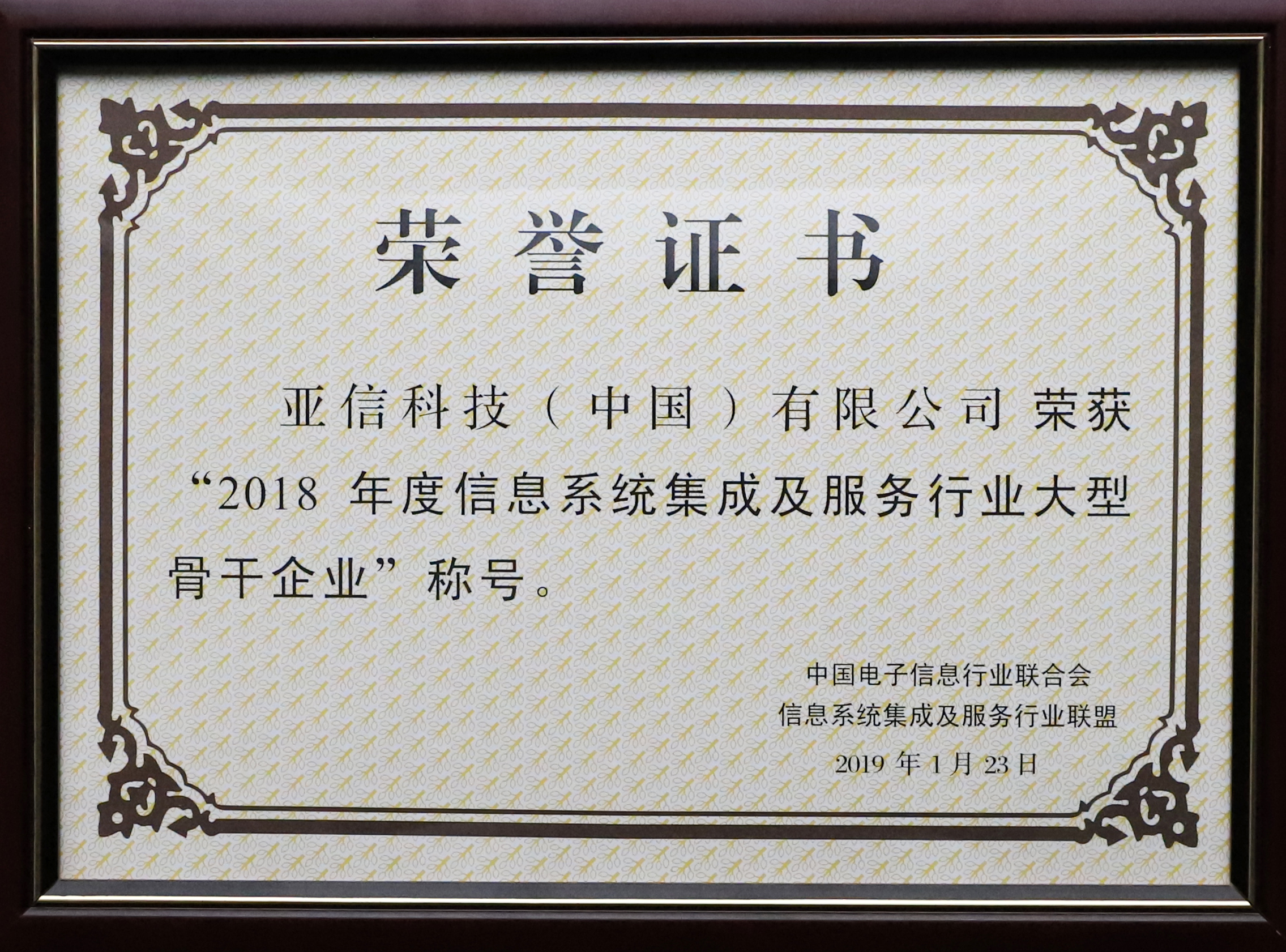 2019年1月 304am永利集团荣获“2018年度信息系统集成及服务行业大型骨干企业”