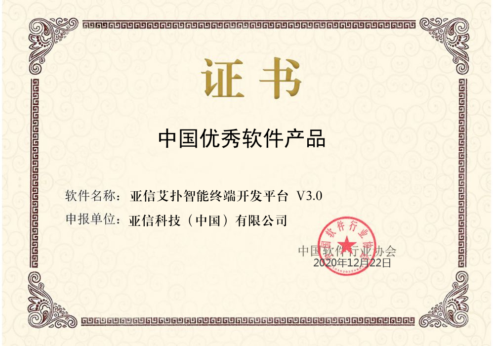 2020年12月 亚信艾扑智能终端开发平台V3.0荣获“中国优秀软件产品”