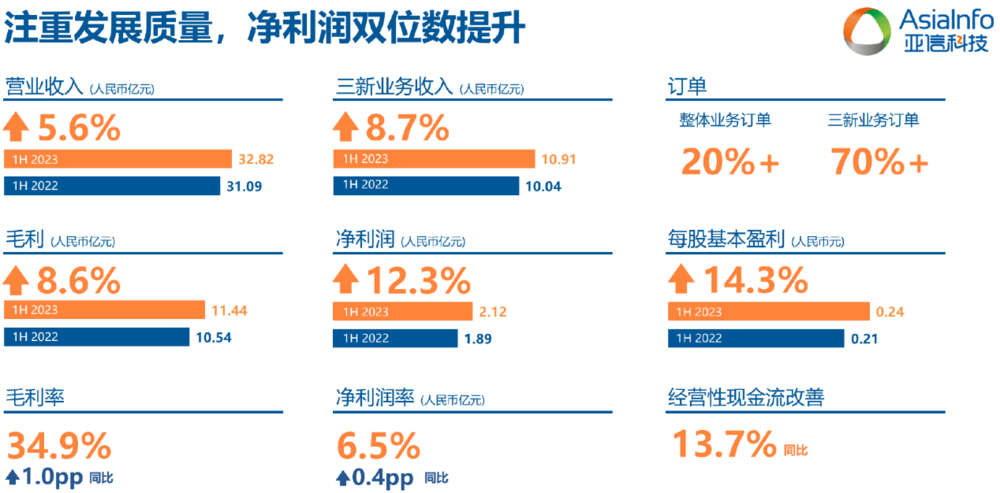 除了三个新的领域之外,传统业务BSS领域(运营商业务支撑系统)也在稳固发展,上半年收入为21.05亿元,把政企服务、新的技术云原生技术应用于传统系统带来了新的机会,新的技术拉动上半年收入小幅增长1.9%,占总营收比重为64.1%。